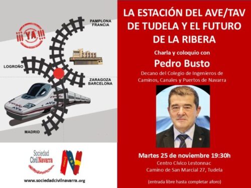 Centro Civico Lestonnac Caminio de San Marcial 27, TudelaEl martes 25 de noviembre a las 19:30h, Sociedad Civil Navarra (SCN) organizará una conferencia con D. Pedro Busto, decano del Colegio de Ingenieros de Caminos, Canales y Puertos de Navarra, que nos explicará las dificultades técnicas y los inconvenientes que supondría mantener la estación en el centro Tudela. La charla y el coloquio posterior tendrán lugar en el Centro Cívico […]