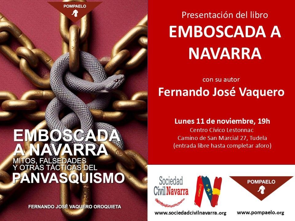 El próximo lunes día 11, tendrá lugar en Tudela la presentación del Libro Emboscada a Navarra. Mitos, falsedades y otras tácticas del panvasquismo de Fernando José Vaquero. El acto tendrá lugar en el centro Cívico Lestonnac (Camino de San Marcial 27, Tudela) y es organizado en colaboración con la asociación Pompaelo, que es además la editora del libro.